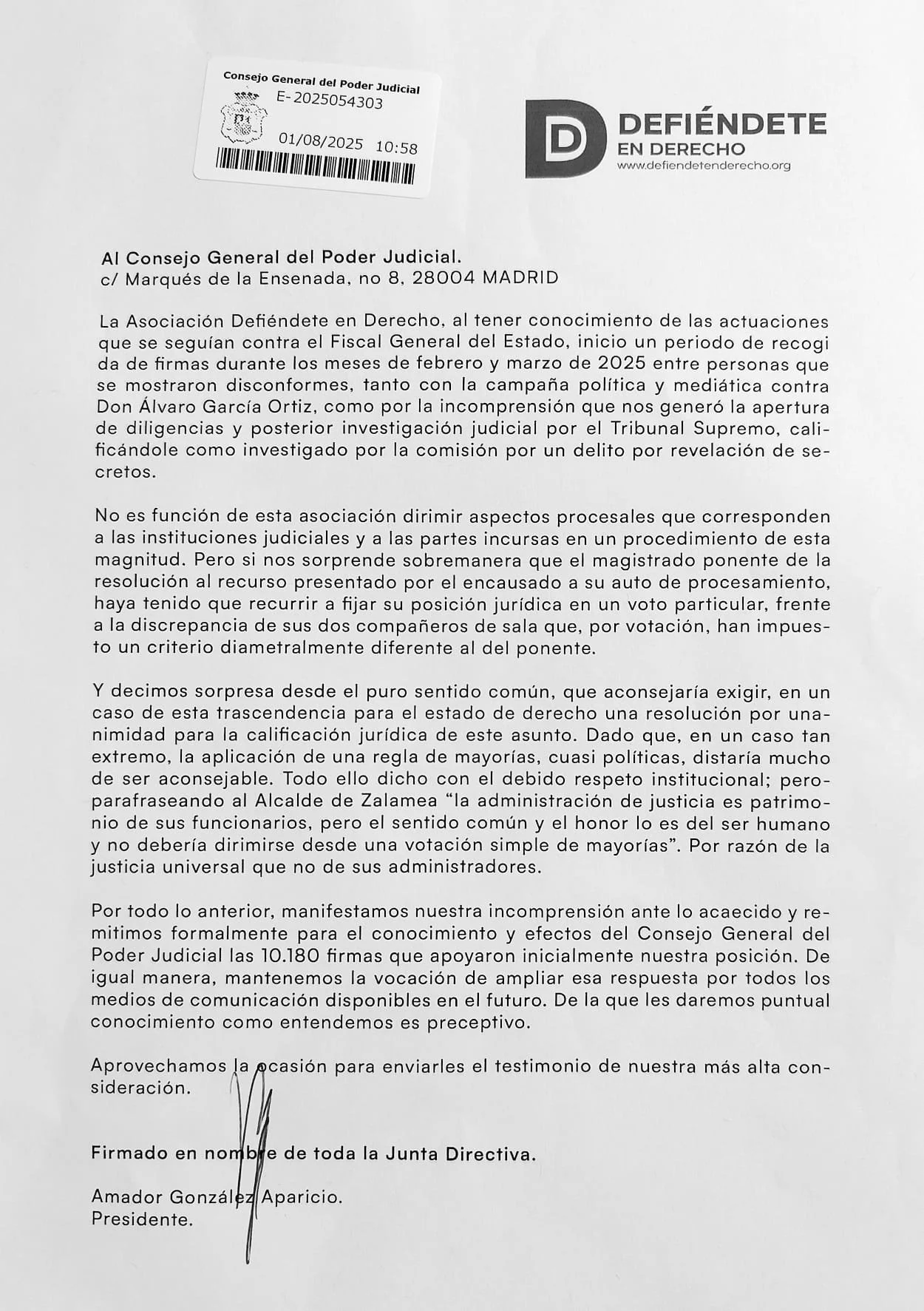 En consecuencia, la Asociación Defiéndete en Derecho quiere solidarizarse con el Fiscal General del Estado, Don Álvaro García Ortiz, deseándole perseverancia y continuidad en el desempeño de sus funciones. Por todo lo anterior, abre el correspondiente pliego de firmas a toda la ciudadanía que desee apoyar este escrito.